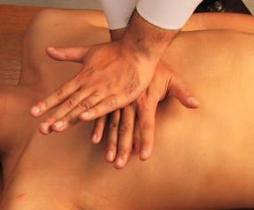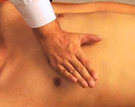 胸骨の下半分に一方の手掌の基部を置き(左上図)、他の手をその手の上に重ねる(右上図)。訳出に困った heal of the hand とは、手掌基部(手―たなごころ―の、足で言えば「かかと」にあたる部分、左下図)