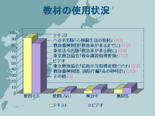 図49.新しい心肺蘇生法の市民指導で用いる参考資料等に関して イ)新しい心肺蘇生法の市民指導で用いるテキストについて a.心肺蘇生法の指針(へるす出版)を用いる。 b.所属で作製した資料を用いる(可能でしたら資料を同封願います)。 c.複数の資料を用いる(資料名: ) d.その他:具体的に記載して下さい ロ)新しい心肺蘇生法の市民指導で用いるビデオに関して a.心肺蘇生法指導員用ビデオ(東京救急協会編)を用いる。 b.所属で作製したビデオを用いる(可能でしたらビデオをお貸し下さい)。 c.複数のビデオを用いる(ビデオ名: ) d.その他:具体的に記載して下さい