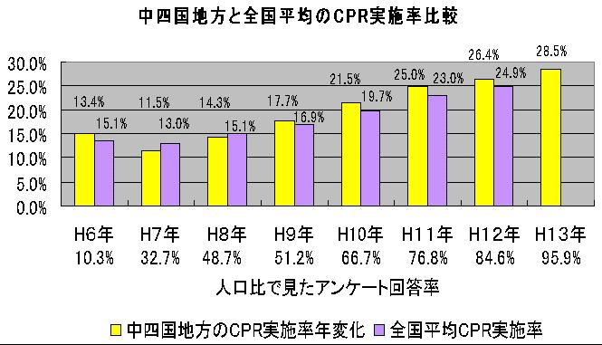 中四国地域のバイスタンダーCPR実施率の推移(黄色の棒グラフ)を示す(紫色の棒グラフは全国の平均値)。年表示の下の数字は人口の重み付けをした回答率(回答した消防本部の管轄人口の総和を該当年の中国四国地方の総人口で除したもの)。過去に遡るほど調査を行っている消防本部は少なくなるので、中四国地方全体を代表する数字とは言えなくなっている。