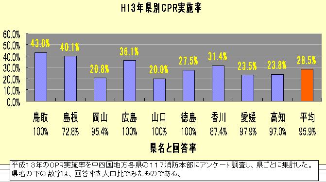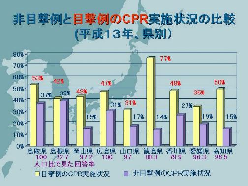 ☆シンポジウム3.新しい心肺蘇生法をどう教えるか7.管轄地域のバイスタンダーCPRの統計(平成13年1〜12月)に関して イ)所属救急隊が搬送したすべての心肺停止傷病者数。 ______例 ロ)イのうち、居合わせた市民(非番の救急隊員や医療従事者も含む)によって人工呼 吸、心臓マッサ−ジまたはその両方が実施された傷病者数。 ______例 ハ)ロのうち、発症の時点が市民によって目撃されたもの。 ______例 ニ)イのうち、発症の時点が市民によって目撃されたもの(目撃CPRの総数)。 ______例 8.管轄地域のバイスタンダーCPRの統計に関して 消防庁統計によって計出されたバイスタンダーCPR実施率(上記の、ロ÷イ×100%) を過去10年についてお教え下さい。(データがない年は記載不要です。) 平成 13年 %, 12年 %, 11年 %, 10年 % 9年 %, 8年 %, 7年 %, 6年 % 5年 %, 4年 %, 3年 %