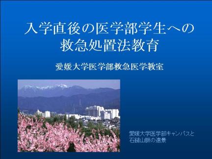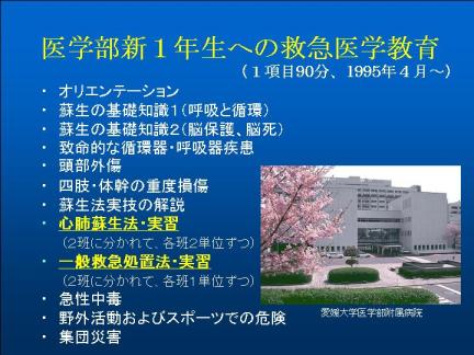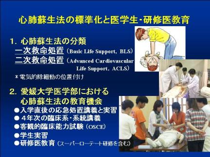 一方、愛媛大学医学部における心肺蘇生法の教育機会には、入学直後の応 急処置講座、4年次の系統講義、客観的臨床能力試験(OSCE)、学生実習、 そしてスーパーローテート研修を含む研修医教育があります。