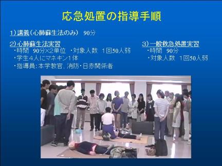 心肺蘇生法については1回約50人の学生に対し、90分カケル2単位の実 習を行います。学生4人に訓練マネキン1体を準備し、本学教官、地元消 防職員、赤十字関係者など7、8人が実技指導にあたります。さらに止血 法、包帯法などの一般応急処置の実習を90分1単位実施します。