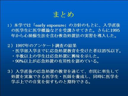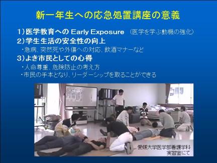 1997年に学生に対して行ったアンケート調査の結果では、医学部入学ま でに応急処置教育を受けた者は25%以下でした。大半の学生は応急処置に 興味を示し、またその有用性を認めています。入学直後の応急処置の教育 を通じて、市民に率先して 処置を実施できる医学生を養成し、同時に医 学を学ぶ上での自覚を促すものと期待しています。