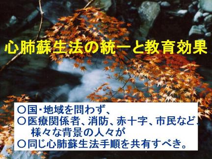 さて、消防職員や赤十字関係者との交流を通じて問題となるのは、団体 によって心肺蘇生法の指導内容が異なることでした。心肺蘇生法を効率的 に普及させるためには、国・地域を問わず、医療関係者、消防、赤十字、 市民など、様々な背景の人々が同じ手順を共有する必要があります。