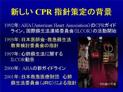 心肺蘇生法の統一に関し国際的な流れをみますと、1992年の米国心臓協 会(AHA)の指針策定のあと、国際蘇生法連絡協議会(ILCOR)が組織され ました。その後、ILCORの協力のもとに策定された2000年の AHA指針は、実 質的な世界指針とみなされています。そしてこれをもとに日本救急医療財 団 心肺蘇生法委員会(JRC)により、わが国の新しい心肺蘇生法指針が策 定されました。