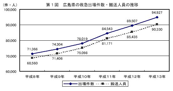 ○ 近年の救急出場件数の状況は,第1図のとおりである。平成13年中の本県の救急出場