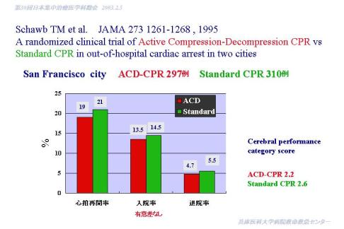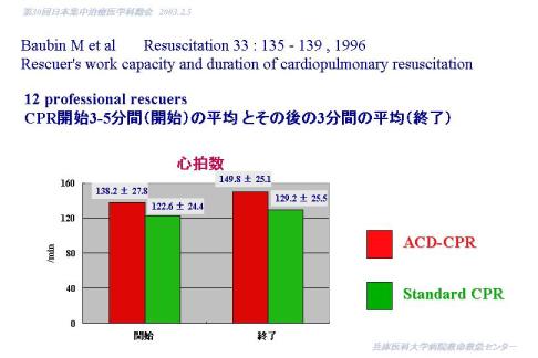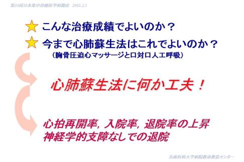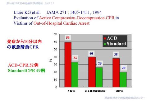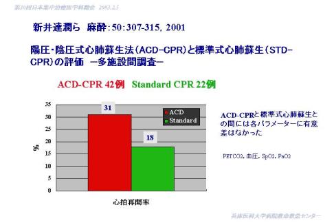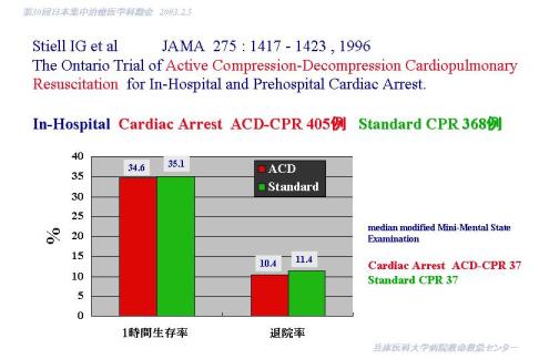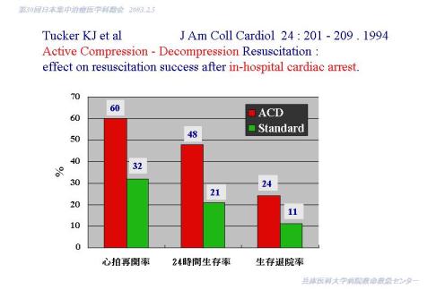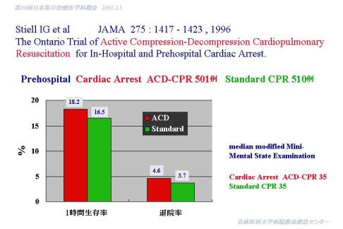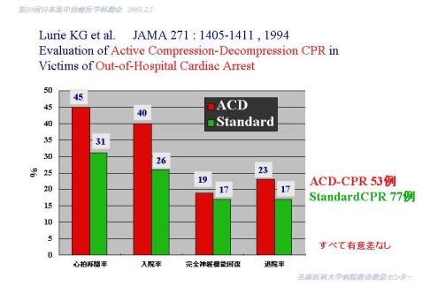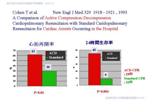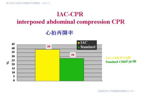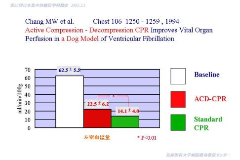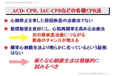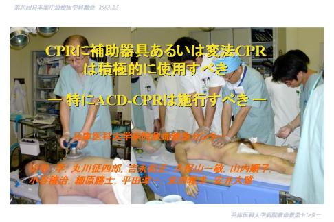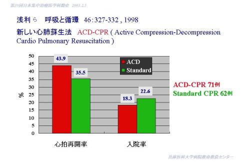 しかし,ACD- CPRなどの各種CPR法は心肺停止を来した原因疾患の治療法でなく,循環動態を良好にし,心拍再開率を高める治療法,と捉えるべきである。心拍再開が得られてはじめて,次の原疾患治療へとつながり,さらに救命率の向上がえられることになる。それゆえ,心拍再開率を高めるACD-CPRや簡便な新たなCPR法は積極的に試みるべきであると考える。