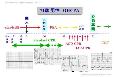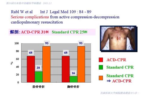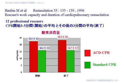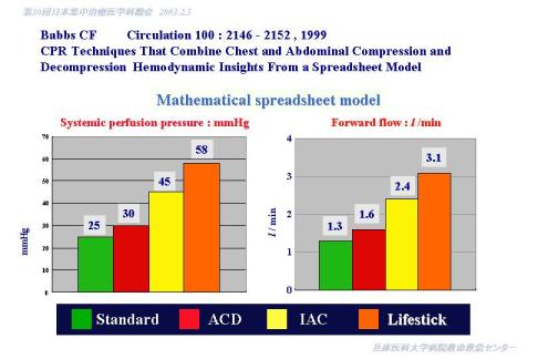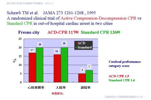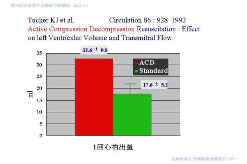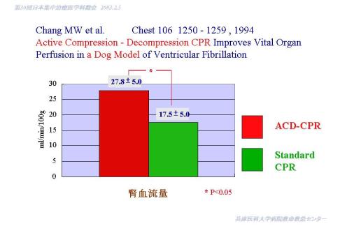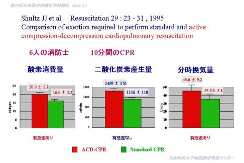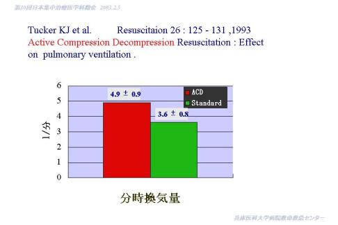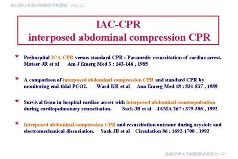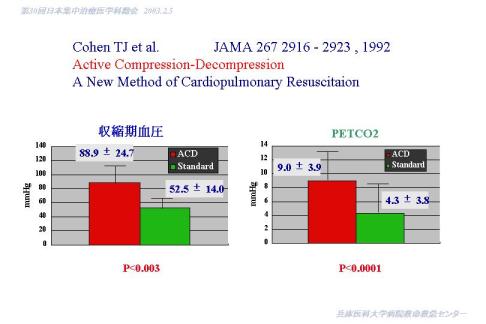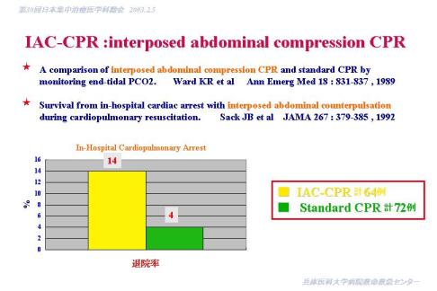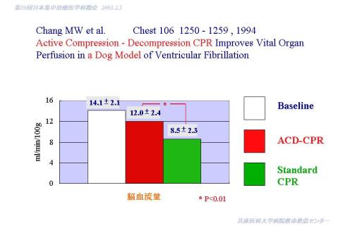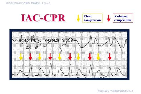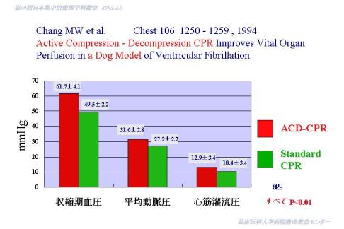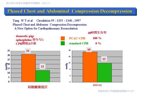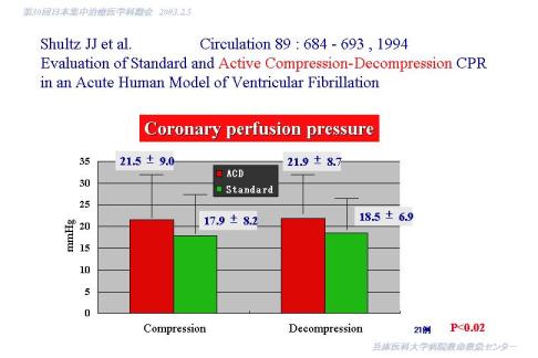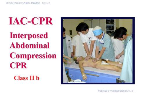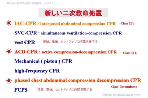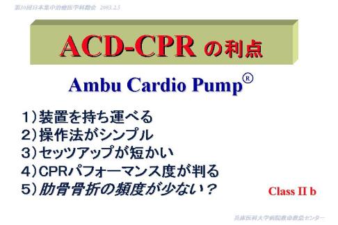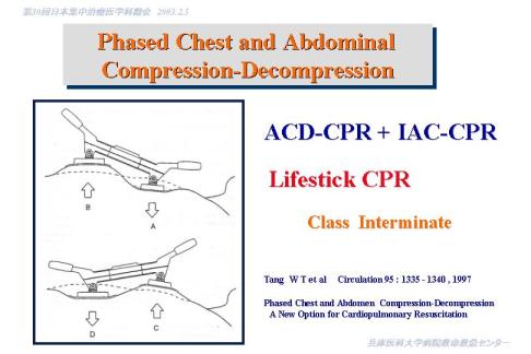pneumatic vest,PCPSは装置が複雑かつ高価で,セットアップに時間がかかる,interposed-abdominal-counterpulsation CPRは3人の術者が必要であるなどの欠点があり,緊急時にどこでも容易に施行できない。一方,ACD- CPRは,1)装置を持ち運べる,2)操作法がシンプル,3)セッツアップが短かい,4)CPRパフォーマンス度が判る,4)肋骨骨折の頻度が少ない?,などの利点があり,当施設でも症例によって使用している。