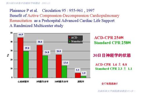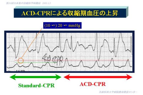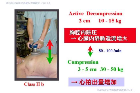 ACD-CPRは用手的に胸郭を能動的に圧迫し(compression:30kg〜50kg),また能動的に拡がらせる(decompression:〜−15kg)ことによるCPR法で,decompression時に大きな胸腔内陰圧となり,心臓への還流血液量が増加する。そのため,標準CPRより心拍出量の増加(1.0l/min),動脈収縮期血圧の上昇(通常10〜25mmHg上昇),平均動脈圧の上昇,拡張期圧の上昇,圧冠動脈灌流圧の上昇(>10mmHg),重要臓器血流量の増加,心筋血流量の増加,脳血流量の増加,PETCO2の上昇がえられる。短期的予後としての心拍再開率,24時間生存率は向上し,ACD-CPRの有効性が見いだされているが,長期生命予後,社会復帰率,脳神経予後に関しては統計学的に有効な結果が得られていないため,AHAのCPRガイドライン2000では2bとランクされた。