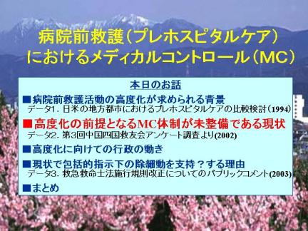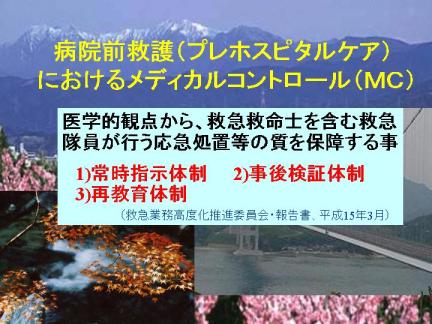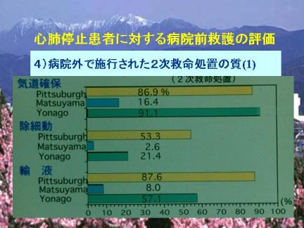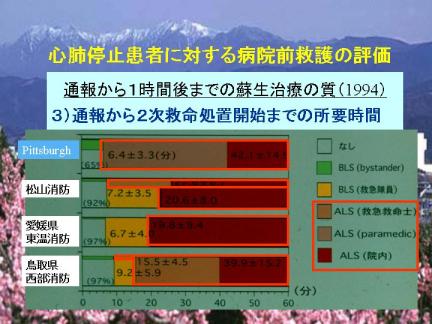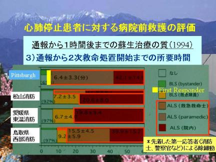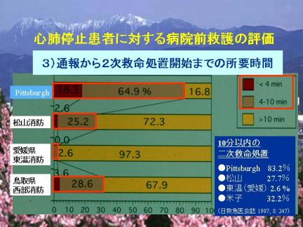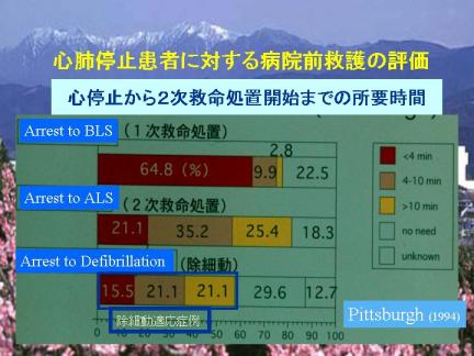 第2に、通報から二次救命処置までの時間を比較しました。Pittsburgh では約6分でパラメディックが到着し、除細動・蘇生薬の投与をはじめと する高度な蘇生治療を開始します。わが国では通報から7〜9分で救急車 が到着しますが、当時、救急車に救急救命士が乗車していたのは4分の1 にも満ちませんでした。救急救命士が乗車していても、彼らの活動は医師 に連絡した上で除細動などを行う必要があること、気管挿管や薬物投与が 許されていないなどの点で、限界がありました。