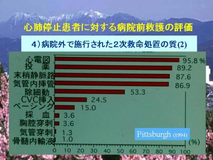 Pittsburghでは気道確保の方法として気管挿管が標準となっています。 また無線での指導やドクターカーで出動した医師の協力のもとに、各種の 薬剤投与、ぺーシングなども積極的に行われています。米国では1994年当 時から、日本の救急外来で行われている蘇生治療が現場で開始されている と考えることができます。