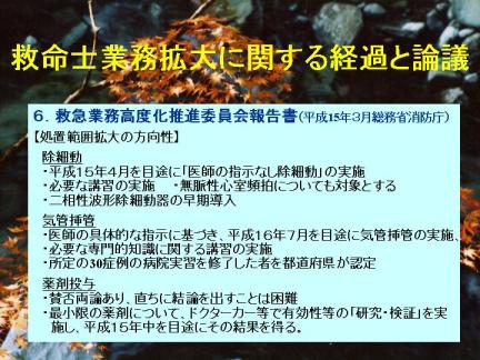 この「救急業務高度化推進委員会報告書」において、処置範囲拡大の方向 性として、本年4月を目途に「医師の指示なし除細動」を実施することが示 されました。また平成16年7月を目途に医師の具体的指示に基づく気管挿管 の実施を許可する方針とされました。薬剤投与についてはドクターカー等で 有効性の「研究・検証」を実施することとなりました。