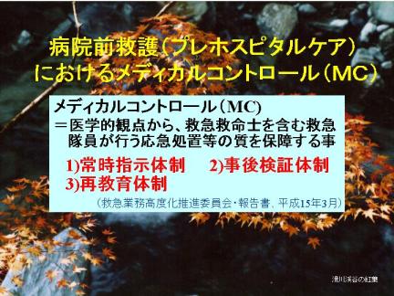 平成13年、総務省消防庁の「救急業務高度化推進委員会報告書」でも、 救急業務の高度化を図るために、メディカルコントロール体制の確立が急 務とされました。