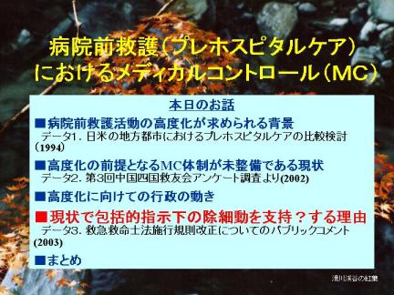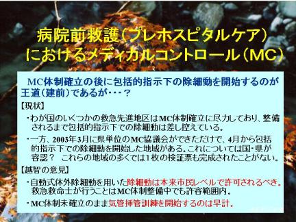 次に本日の4つ目の話題として、メディカルコントロール体制の整備が不 十分な現状で包括的指示下の除細動を実施してよいか、という論議を取り上 げさせていただきます。
