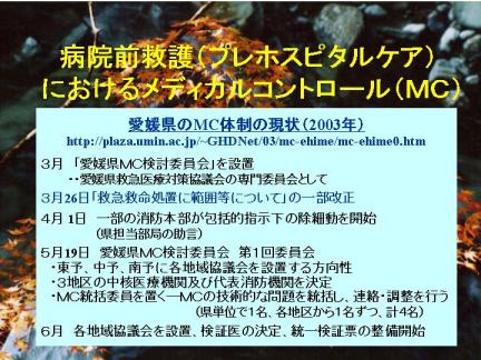 平成15年3月総務省消防庁の「救急業務高度化推進委員会報告書」では メディカルコントロール協議会設置状況が紹介されています。今年2月の 段階で都道府県メディカルコントロール協議会を設置済みの都道府県数は 35、地域協議会については25となっています。本年年3月末を目途に全て の都道府県において設置される見込みと付記されていますが、いかにも付 け焼き刃的なメディカルコントロール体制の整備ではありませんか? な お愛媛県では県の協議会が最初に開催されたのは本年5月、地域の協議会 は6月スタートとなりました。