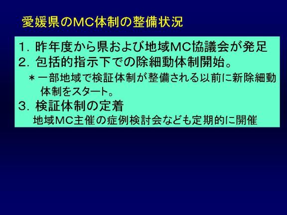 次に、愛媛県のMC体制の整備状況につい て報告します。本県では昨年度、県および地 域MC協議会が発足し、包括的指示下での除 細動体制が開始されました。なお、この際、 一部地域では1枚の検証票も書かれないうち に新除細動体制に踏み切るという足並みの乱 れもありました。その後、検証体制が正式運 用され、また救命士の生涯教育の体制、症例 検討会開催などの活動も定着して来ています。