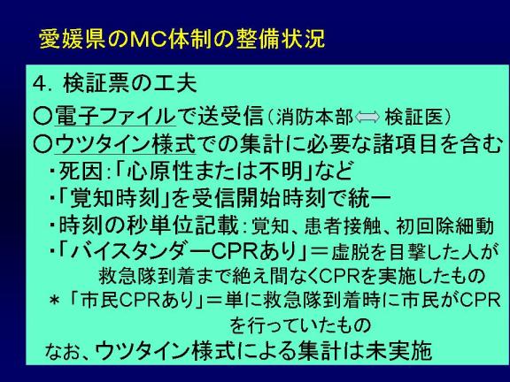 本県における検証体制の工夫点ですが、検 証票にはウツタイン様式による集計に必要な 諸項目がすべて含まれ、電子ファイルで送受 信されています。心停止の原因は「推定心原 性」などウツタイン様式に準拠して分類され ます。また「覚知時刻」は受信開始時刻で統 一され、患者接触時刻、初回除細動時刻など とともに秒単位まで記載されます。一方、 「バイスタンダーCPRあり」は虚脱を目撃した 人が救急隊員到着まで絶え間なくCPRを実施し た場合とし、単に救急隊員到着時に市民がCPR を行っていた場合と区別できるようになって います。ただし、残念ながらウツタイン様式 による集計・解析は未だ行われていません。