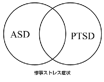 ASDとPTSDの特徴は両者とも,1. 客観的に見て自分又は他人の身体的安全が脅かされるような出来事で,主観的にも強い恐怖などを感じた出来事であり,2.出来事が思考・心像・夢などの形で再体験され(再体験症状),3.外傷を想起させる場所や物を避け(回避症状),4.睡眠障害,集中困難などの覚醒亢進が出現し(過覚醒症状),5.症状による著しい苦痛や社会的領域などにおける機能が障害されること,が共通して認められる。これに加えASDでは6.孤立感,現実感消失,離人症,解離性健忘などが認められ(解離性症状),7.外傷後4週間以内に発症し,その4週間以内に消失する,という基準がある。PTSDでは6.症状の持続が1ヶ月以上という基準がある。ASDの症状が持続してPTSDの診断基準を満たした場合はASDからPTSDに移行したと診断する。急性のストレス反応は自然な現象であり,多くの場合,速やかに自然回復すると言われている32)。これに対してPTSDの症状の持続は様々であり,症例の約半分は3ヶ月以内に完全に回復するが,他の多くの症例では外傷を受けてから12ヶ月以上経っても症状が持続している(DSM-W-TR)。 DSM-W-TRに従うと,外傷体験後のASD・PTSDの経過として1.ASDを発症してPTSDに移行,2.ASDのみの発症,3.PTSDのみの発症,4.両者とも発症しない, という4つのパターンが考えられる。惨事ストレス症状はASDとPTSDの各症状を含むさらに幅広い概念で,両者ほど厳密な基準はなく,列挙された症状が一つでもあれば惨事ストレス症状と認められる。(図)つまりこの4パターンの全てと惨事ストレス症状が合併し得ることになる。