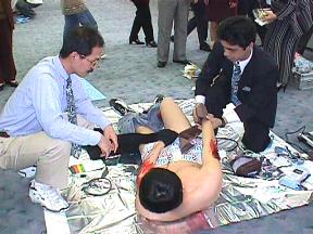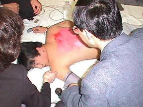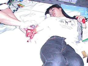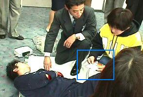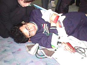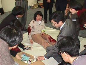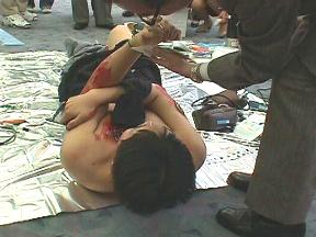 包帯で止血、創部保護。模擬患者は苦痛の表情。
