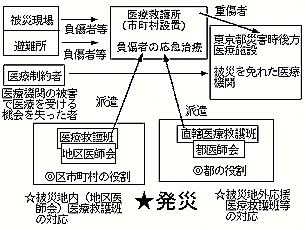 このように都医師会は、被災地区内での地区医師会救護班として、また都直轄医療救護班として、医療救護活動に従事する。