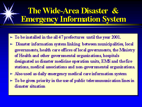 広域・災害救急医療情報システムの地域センターは5カ年計画で整備されており、2001年には全都道府県に導入が終了することが期待されています。このシステムでは、災害時にはスライドに示すような様々な組織や市民を結びつけます。一方、日常的には、病院の端末から救急収容できる患者数や対応できる診療科などを入力することができます。本システムの災害時の通信を円滑に行うために、専用線、優先的な公衆回線および衛星回線が確保されています。
