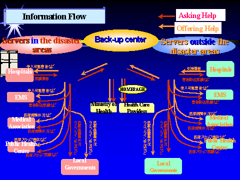 スライドはこのネットワークを介する、災害時の情報の流れを示しています。被災地域の病院、救急医療システム、医師会、保健所、自治体などは、各施設の被災状況や収容患者数、転送したい患者数、受け入れたい医療チーム、ボランティアなどに関する要請情報をシステムを介して送信します。
