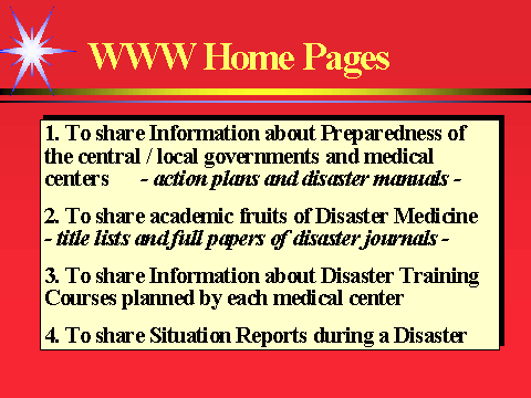 1) 政府や各自治体、災害基幹病院などの災害準備に関する情報を共有すること、
