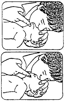 | 4. 口と鼻が覆えなくても鼻だけは覆える(口―鼻人工呼吸)。 5. 息を吹き込む。 | |
