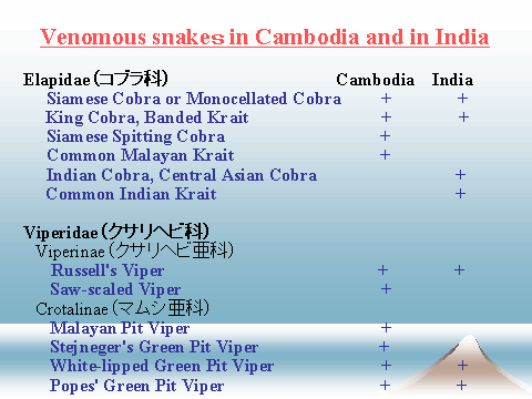Fig.1 shows the course of the information relay. By August 18th, the EHA could contact specialists from Colorado State University and Japan Snake Institute. They recommended purchasing the antiserum from The Serum Institute of India, as India shares many families of snakes with Cambodia (Tab.1) and as the Institute might have stored enough volume of antiserum. Finally, in Aug.18, antiserum for 100 persons was ordered to the Serum Institute of India, and was transported to Cambodia by air. On 19, additional information about the proper quantity of antiserum was sent from Japan Snake Center to the EHA.