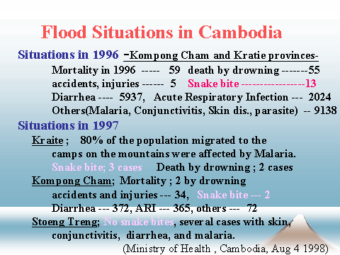 On Aug. 6, 1997, request for snake antiserum for 100 people was sent from the Government of Cambodia to the Emergency and Humanitarian Action (EHA), Western Pacific Regional Office. There had been a serious flood in Cambodia and quite a lot of snakebite cases were expected aftermath the flood. However, they could provide only few types of monovalent antiserum, and also they had very limited information about the snakes in Cambodia.