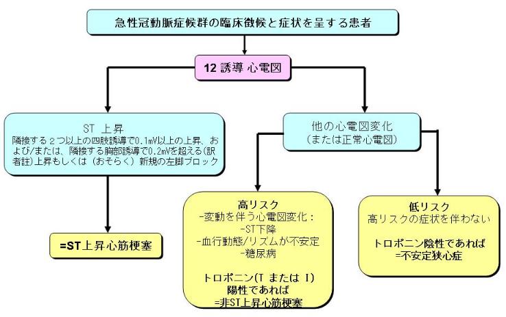 典型的な症状すなわち放散する胸痛、息切れあるいは冷汗などはAMIの患者の方が強く、より長く続くと考えられるが、これだけではAMIの診断を確定するには十分に特異的とは言えない。典型的な病歴がある状況でACSあるいはAMIを除外するには、12誘導心電図、心筋生化学マーカー、その他の診断的検査が必要になる。高齢者、女性あるいは糖尿病患者では、症状が典型的でなかったり、一般的でない所見を呈する(unusual presentations may occur)ことがある6,7。