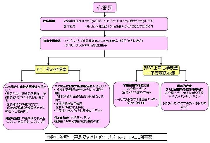 予防的な治療は遅くとも、ACSの診断が確定し最初の入院となった時点に開始すべきである。薬剤への禁忌や認容性が低くない限り(unless contraindicated or poorly tolerated)βブロッカーはできる限り早期に開始すべきである。ACE阻害薬はSTEMIの全患者に、左室機能不全のある患者を含め投与すべきである。薬剤が禁忌でなく認容性が低くない限り、ACE阻害薬を考慮すべきである(訳者註)。左室不全がある患者でACE阻害薬に認容性がない場合、ACE阻害薬の代わりにアンギオテンシンII受容体阻害薬を投与しても良い。