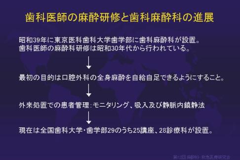 それでは、研修についてはどうだったのかと申しますと、東京歯科大学からの依頼により昭和34年に東京大学医学部麻酔科で最初の研修が行われ、その後、複数の大学で研修が行われるようになりました。