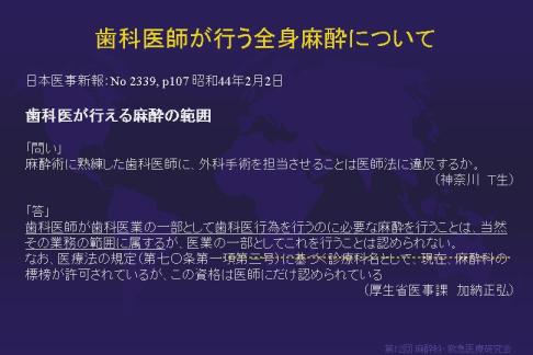 この歯科麻酔の発展の途中で、歯科医師が行う麻酔と医師が行う麻酔についての疑義が無かったのかと申しますと、多少あったらしいとがわかりました。