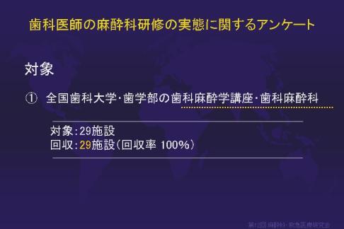 調査は、研修委託の歯科側と研修受け入れ側の研修施設両方に行われましたが、まずは研修委託の全国歯科大学・歯学部の歯科麻酔学講座・歯科麻酔科29施設より得られた結果を報告します。