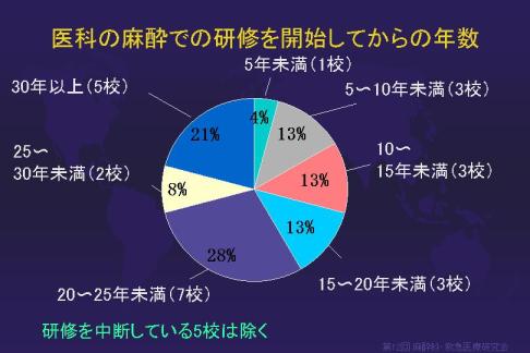 医科の麻酔での研修を開始してからの年数ですが、20年以上にわたり研修を行っていたのは約6割で、対象の8割は10年以上、医科での麻酔研修を行っていることがわかりました。