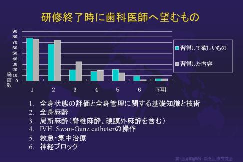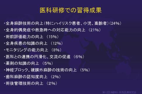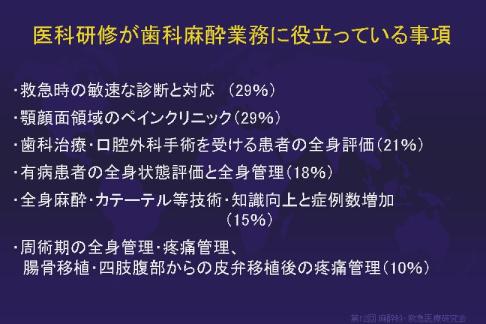 では、具体的に医科研修が歯科麻酔業務に役立っている事項としましては、救急時の診断、対応や、歯科患者の全身状態評価と全身管理などにに関連した技術や知識が習得され、歯科患者に還元、活用されているということがわかりました。これは広く歯科医療の安全性と質の向上に貢献していることも意味しています。