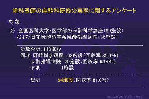 今までは、研修した歯科側からの意見でしたが、ここからは歯科医師を受け入れた研修施設側からの調査についても報告させて頂きます。全国医科大学・医学部の麻酔科学講座 80施設 および日本麻酔科学会麻酔指導病院 36施設の計116施設のうち94施設(81%)より回答をいただきました。
