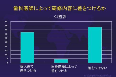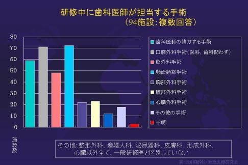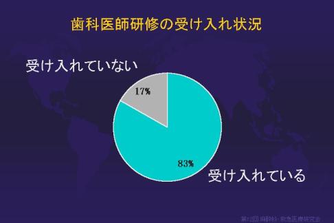 歯科医師の研修を受け入れている施設は83%でした。私の元に正確な資料がないので断定できませんが、全国で約78施設が歯科医師の研修を受け入れている計算になります。