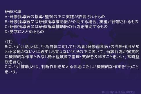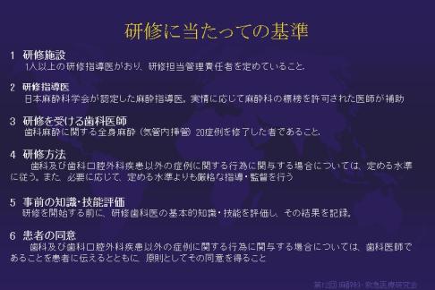 研修を受ける歯科医師は歯科麻酔に関する20症例以上の全身麻酔を修了したものとなっており、医科の麻酔研修を受けるのに基礎的な技術を有しているという基準も定めています。ただこれは施設によっては歯科、特に歯科口腔外科手術が少ないために非常に厳しい基準であるという報告も聞きます。 研修方法で定められた水準については後ほど説明させて頂きます。