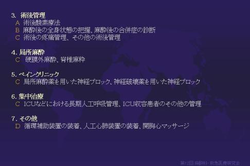 では、実際にどの科の麻酔を研修しているかと申しますと、脳外科についてはちょっと判りませんが頭頚部領域の手術を中心に麻酔を研修していることが判りました。また対象施設が96でありますので約10〜20%の施設では頭頚部領域にとらわれず、開腹、開胸等の手術に関しても麻酔を行っていることが判りました。