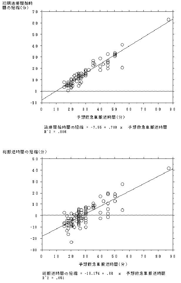 | 初期治療開始時間の短縮(分)=予想救急車搬送時間(分)x0.788-7.55 | ||||||||||||||||||