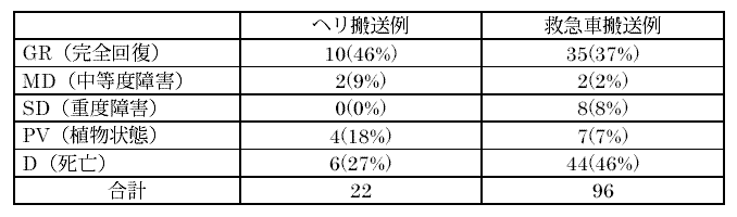 | 3)ヘリ搬送症例は、GR(完全回復)+MD(中等度障害)が12/22(54.5%)なのに対して、救急車搬送では、37/96(38.5%)であった。また、SD(重度障害)+PV(植物状態)+D(死亡)はヘリ搬送が10/22(45.5%)に対し、救急車は59/96(61.4%)であった。 | ||||||||||||||||||