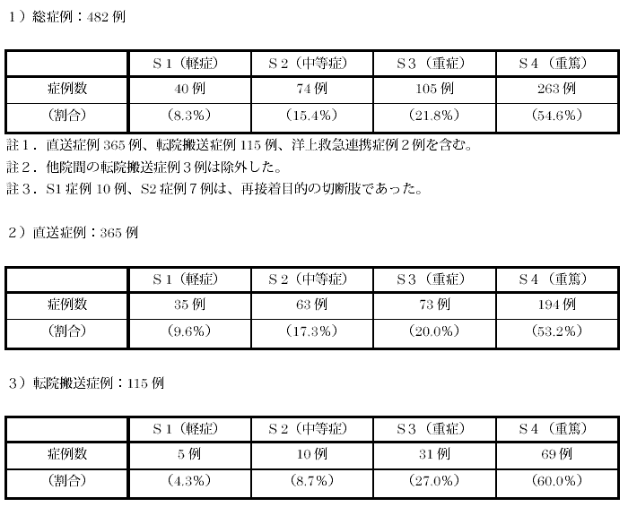 | 直送365症例では、重篤症例は194例(53.2%)、重症症例は73例(20.0%)、中等症症例は63例(17.3%)、軽症症例は35例(9.6%)であり、重症と重篤の症例が73.2% を占めた。転院搬送115症例では、重篤症例は69例(60.0%)、重症症例は31例(27.0%)、中等症症例は10例(8.7%)、軽症症例は5例(4.9%)であり、重症と重篤の症例が87.0 %を占めた。 |