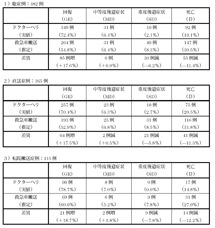 | こうした分析により算出された予後改善効果は、ドクターヘリ搬送により、回復症例が85例(17.6%)増加し、重度後遺症状を残した症例が30例(7.1%)減少し、死亡症例が55例(11.4%)減少したと推計された。この傾向は、直送症例と転院搬送症例でも同様で、差が認められなかった。転院搬送では時間短縮効果、直送では時間短縮効果に加えて早期治療効果が予後に大きな影響を与えていると考えられる。 |