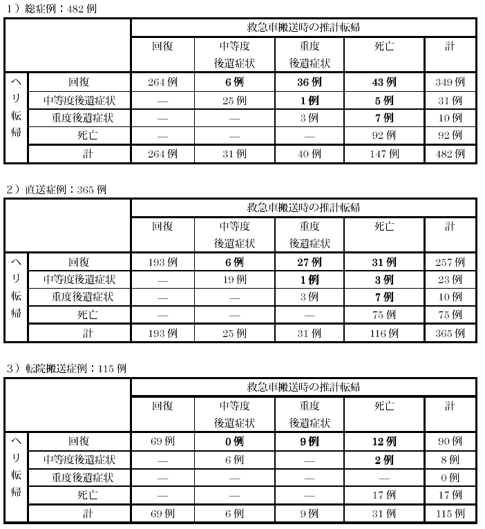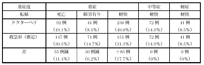 | 逆に言えば、救急車搬送では死亡したと推計された147例のうち、ドクターヘリでは43例が回復、5例がMD、7例がSDであり、重度後遺症状を残したと推計された40例のうち、ドクターヘリでは36例が回復、1例がMDであった。また、中等度後遺症状を残したと推計された31例のうち6例が回復した。 |