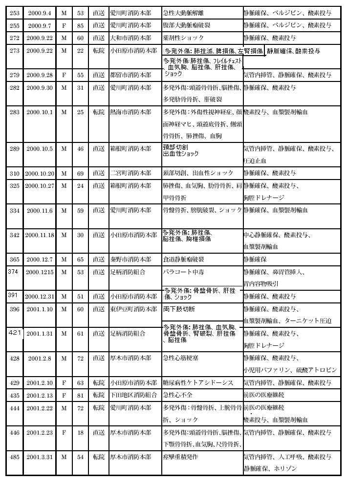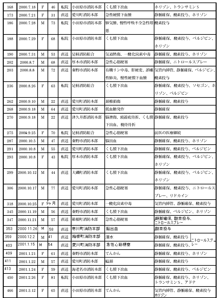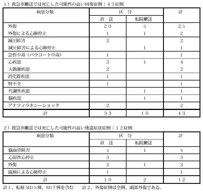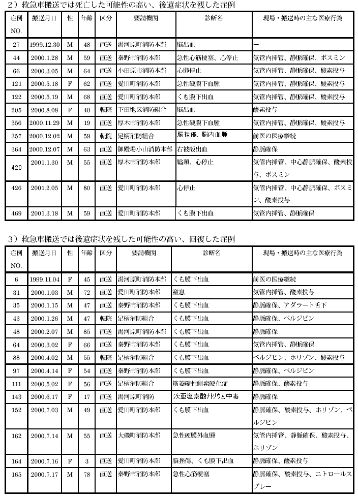 | 脳血管障害5例、心原性心停止3例、外傷3例、溢頚による心肺停止1例は、後遺症状を残したが、救急車搬送では死亡したと推計された。これら12症例のうち8例には気管内挿管が実施され、心肺停止症例にはエピネフリンが投与されている。外傷3症例はすべて頭部外傷であった。 |