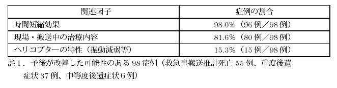 | 予後が改善した可能性のある98症例(救急車搬送推計死亡55例、重度後遺症状37例、中等度後遺症状6例)において、予後に影響を与えたと考えられた因子を表8-8に示す。時間短縮効果が96例(98%)、現場・搬送中の治療内容が80例(81.6%)、ヘリコプターの特性(振動減弱等)が17例(15.3%)であった。 |